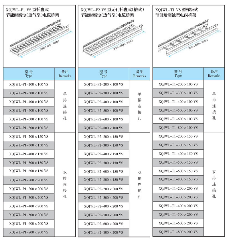 本文介紹XQJWL-P1 VS 型 托盤式節能耐腐蝕(透氣型)電纜橋架、XQJWL-P2 VS 型 五孔托盤式節能耐腐蝕(透氣型)電纜橋架、XQJWL-T1 VS 型 階梯節能耐腐蝕(透氣型)電纜橋架的各種型號詳細參數。