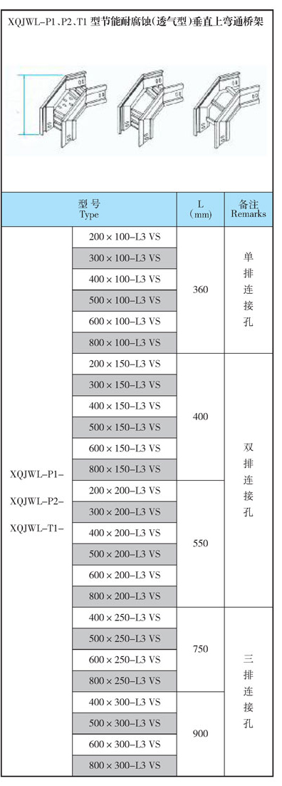 XQJWL-P1、P2、T1型節(jié)能耐腐蝕(透氣型)垂直上彎通橋架型號(hào)參數(shù):